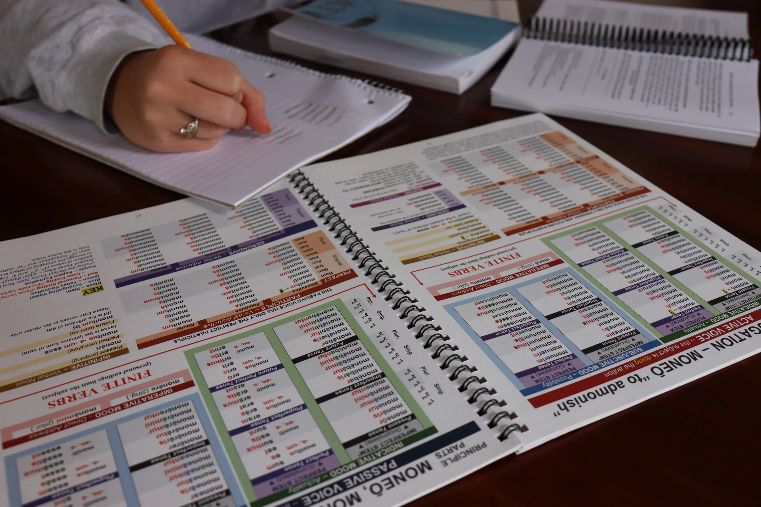 By associating the same colors with the same semantic roles, the charts make it clear how endings and stems function across paradigms—helping students see the system beneath the forms and build true understanding of Latin grammar.